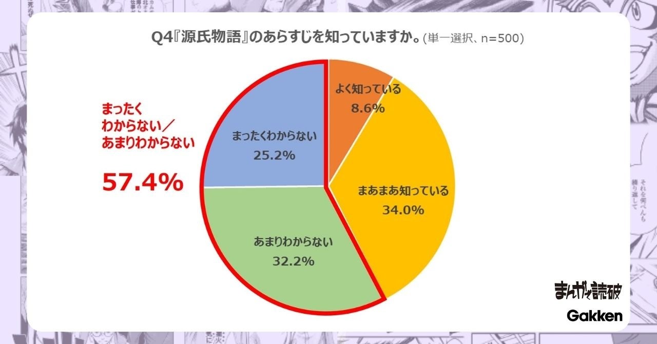【Q4『源氏物語』のあらすじを知っていますか。(単一選択、n=500)】と聞いたところ、「よく知っている(8.6%)」、「まあまあ知っている(34.0%)」、「あまりわからない(32.2%)」、「まったくわからない(25.2%)」となりました。「まあまあ知っている」が最も多かった一方で、「あまりわからない(32.2%)」、「まったくわからない(25.2%)」を合わせると57.4%となり、約6割があらすじをよくわかっていないことがわかりました。