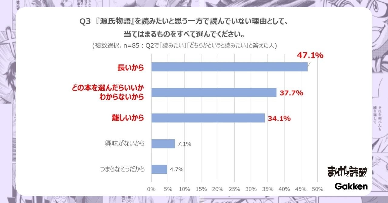 【Q3『源氏物語』を読みたいと思う一方で読んでいない理由として、当てはまるものをすべて選んでください(複数選択、n=85:Q2で「読みたい」「どちらかというと読みたい」と答えた人)】と聞いたところ、多い順に「長いから(47.1%)」、「どの本を選んだらいいかわからないから(37.7%)」、「難しいから(34.1%)」、「興味がないから(7.1%)」「つまらなそうだから(4.7%)」となりました。