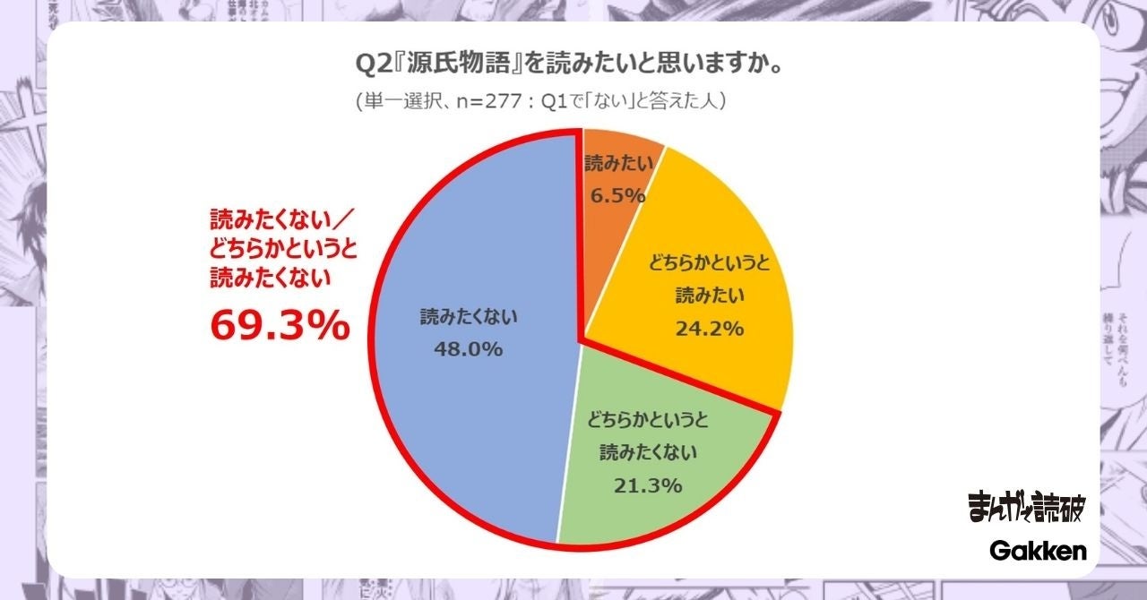 【Q2 『源氏物語』を読みたいと思いますか。(単一選択、n=277:Q1で「ない」と答えた人)】と聞いたところ、「読みたい(6.5%)」「どちらかというと読みたい(24.2%)」「どちらかというと読みたくない(21.3%)」「読みたくない(48.0%)」となりました。