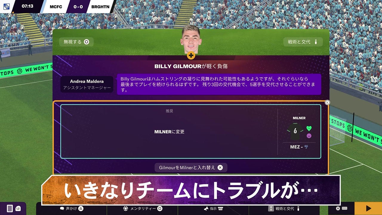 プレイ動画で前園さんは“ブライトン・アンド・ホーヴ・アルビオン”の新監督として、スタメンの選択や戦術を設定のうえ、“マンチェスター・シティ”戦を指揮。自身の現役時代のエピソードを交えながら、プレイスタイルや戦術の指示、アクシデントへの対応などを行い、チームを牽引していきます。