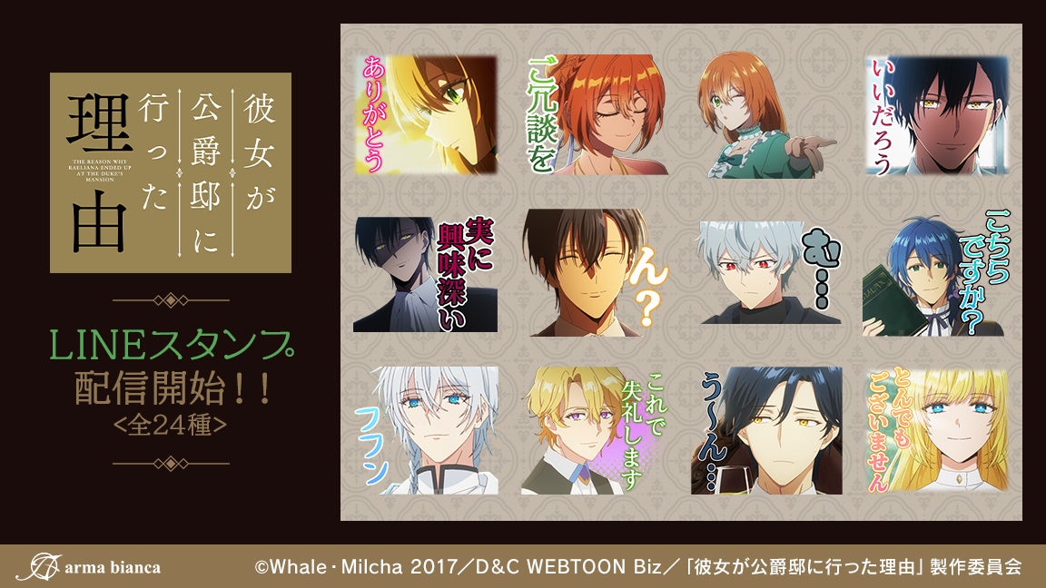 株式会社アルマビアンカはTVアニメ「彼女が公爵邸に行った理由」のLINEスタンプ・LINE着せかえを配信いたします。