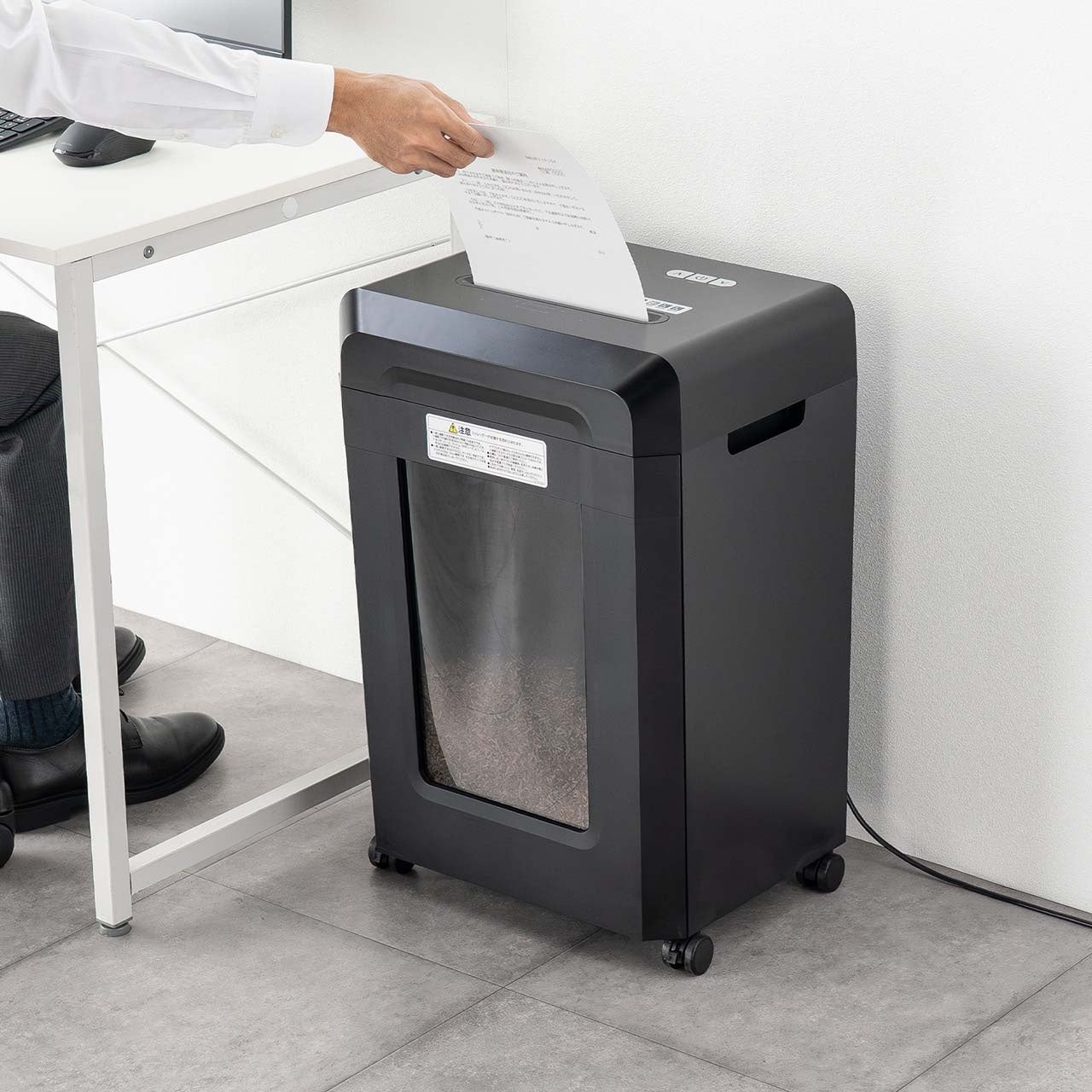動作音はわずか約60dB。あまり気にならない静音設計です。オフィスはもちろん、自宅での在宅ワークにも適しており、夜間でも安心して使用できます。静かに、しかし確実に処理する頼れる相棒です。