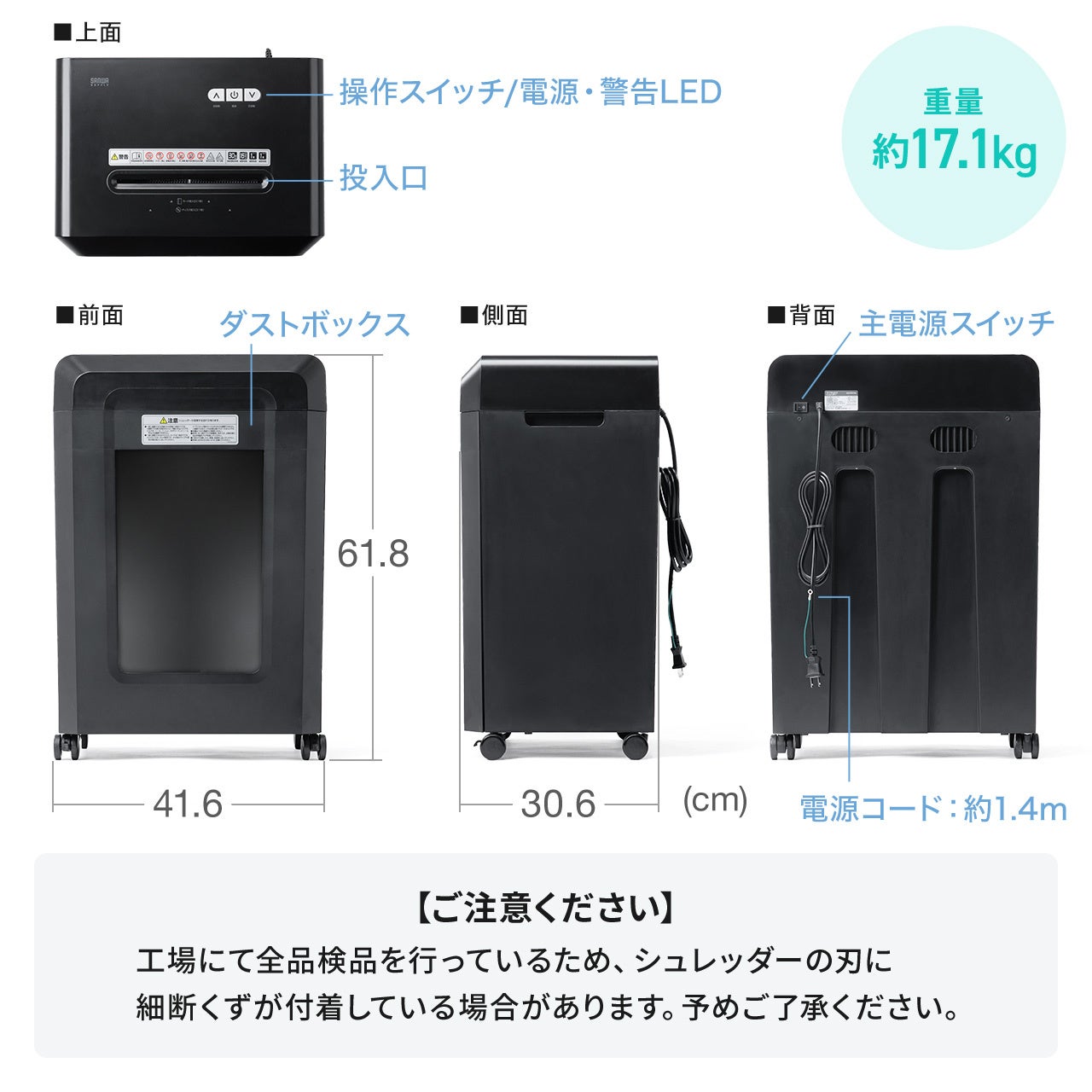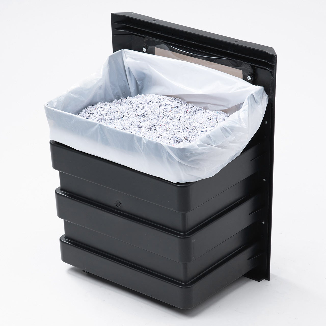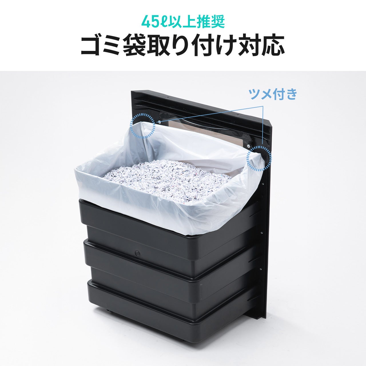 引き出し式の30Lダストボックスは、A4用紙約320枚分の細断くずを収納可能。袋を掛けたまま使用でき、ゴミ捨てもスムーズ。定期的な廃棄作業の頻度を減らし、業務の効率化にもつながります。キャスター付きで移動もラクラクです。