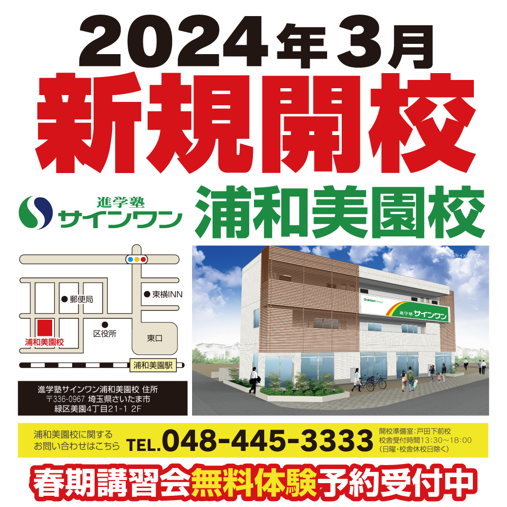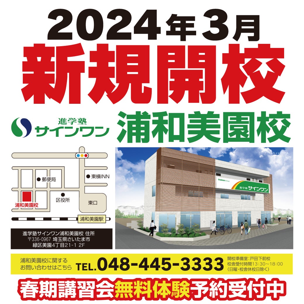 さいたま市緑区・岩槻区(美園小・美園北小・大門小・新和小・野田小・美園中・美園南中・城南中)にお住いの方、大変お待たせいたしました! 進学塾サインワンがついに開校します!