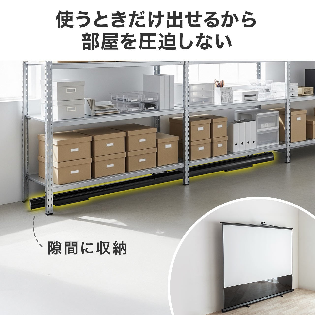 会議室、セミナー会場、展示会、ホームシアターなど、シーンを問わず活躍。設置や撤収が短時間でできるため、イベント運営やプレゼン現場での機動力が向上します。持ち運び可能な「移動型シアター」としても最適です。