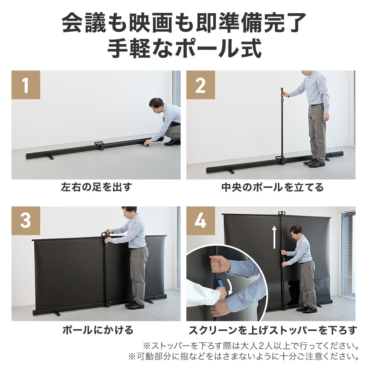 床に置いてポールを立て、スクリーンを引き上げるだけの簡単設置。工具や専門知識は一切不要で、会議やプレゼンの準備がスピーディーに行えます。誰でも扱いやすく、急な映像プレゼンやイベントにも即対応可能です。