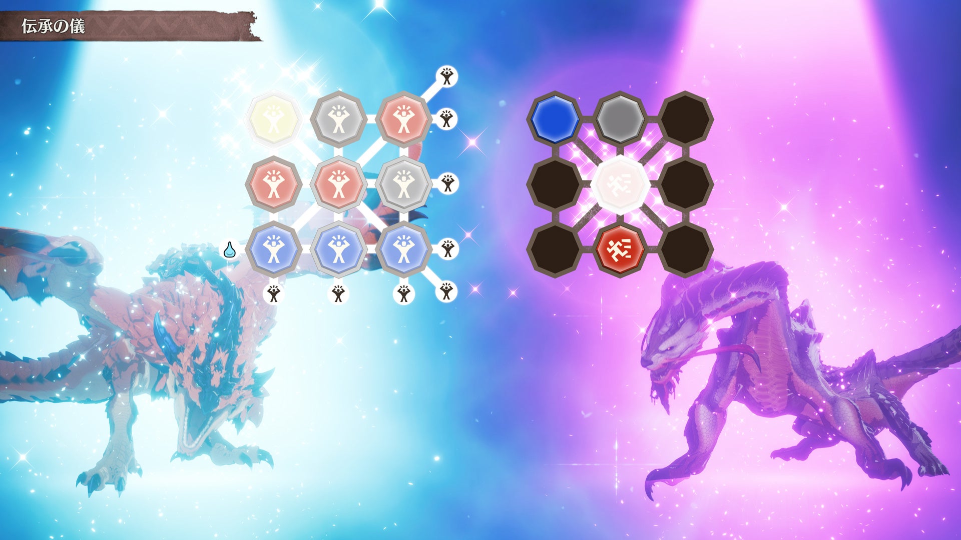 今作では、絆遺伝子を選ぶ際、絆遺伝子の一覧から選ぶこともでき、手持ちに目的の絆遺伝子を持つオトモンがいない場合、該当するモンスターを「フィールドから探す」ことができるようになった。さらに、「伝承の儀」によってオトモンや絆遺伝子が失われることはないので、色々な絆遺伝子の組み合わせを、気軽に試せるようになっている。