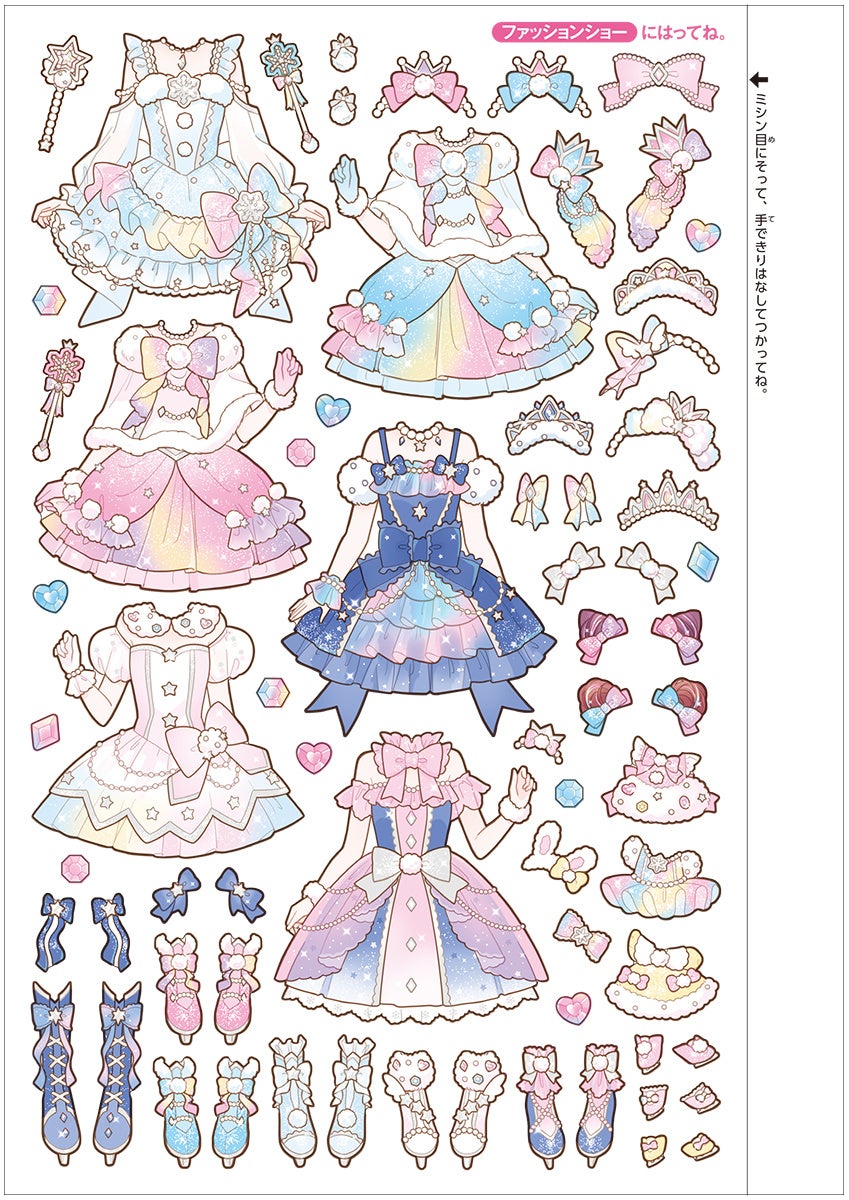 お話の最後には、観音開きの大きなきせかえステージと、はってはがせるシールつき。お話に出てきたドレスをキャラクターに着せてコーディネートできる、シールきせかえが楽しめます。