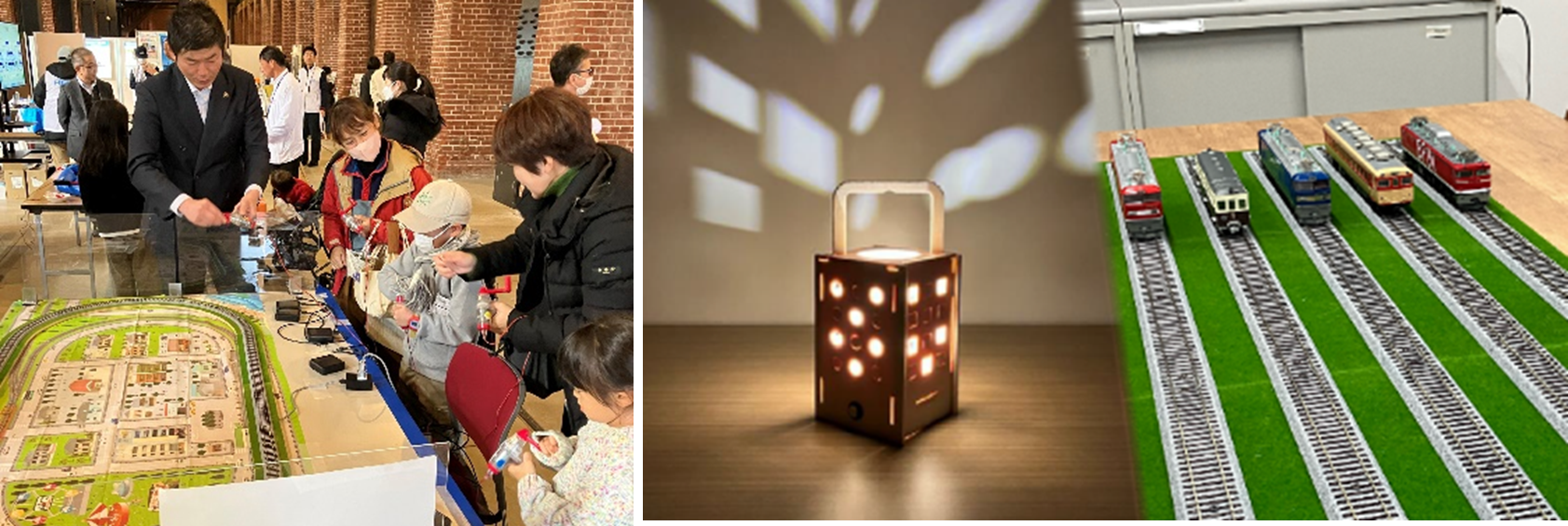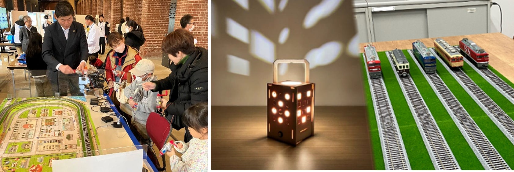 LEDランタンづくりを通じてモノ作りを体験、手回し発電トレインで電気の大切さおよび省エネについて学ぶことができます。