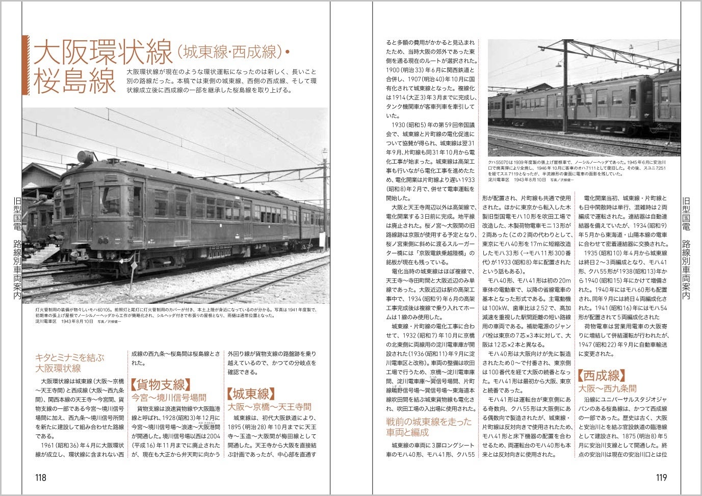 旧型国電は、大阪環状線が成立する以前に引退していますが、城東線・西成線から始まる路線の成り立ちを含めて解説しています。サンプル書面の写真は1943年の撮影です。物資の乏しい戦時中にも撮影を続けた先人には頭が下がります。