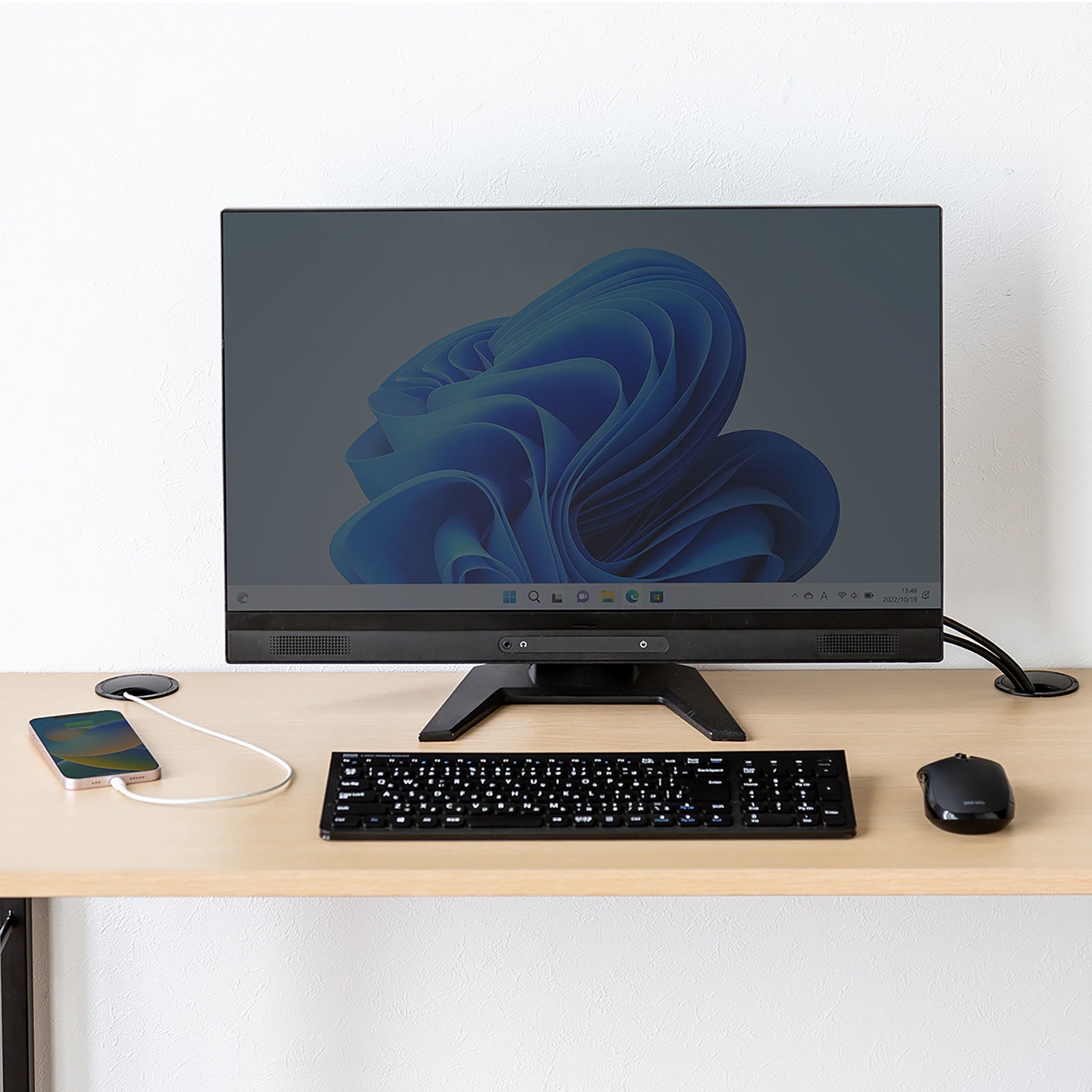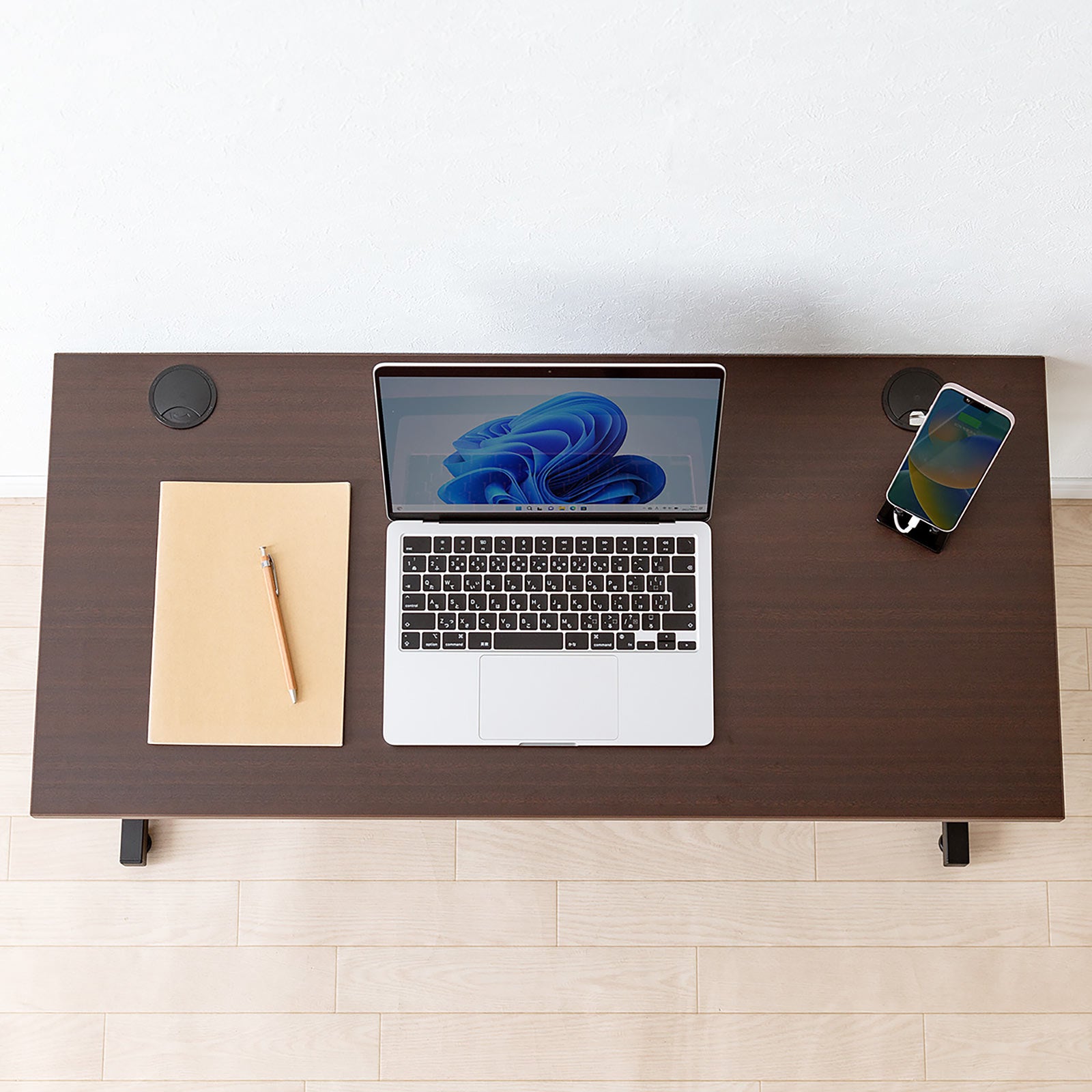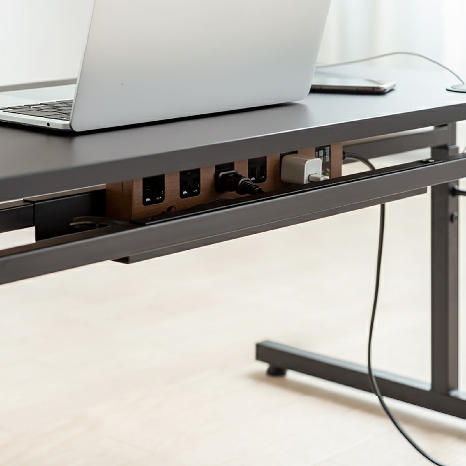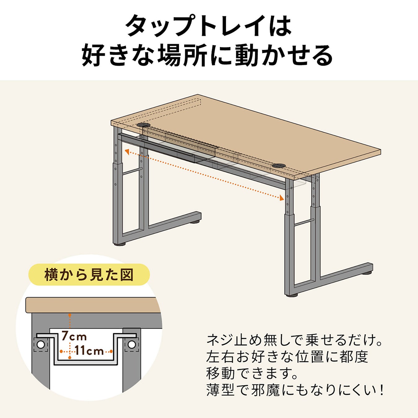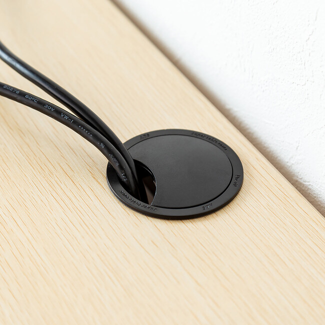 天板には2つのケーブル配線口を装備。PCや周辺機器のコードをすっきり整理でき、壁際に設置しても邪魔になりません。さらにタップ受け付きで足元もすっきり。ホコリ防止にもなり、美しく清潔なデスクをキープできます。