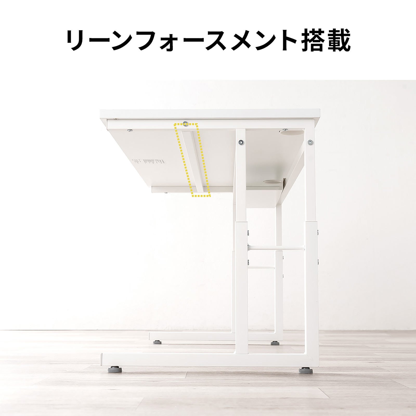 天板裏にはリンフォースメント(補強材)を搭載し、天板と脚部をしっかり固定。ぐらつきや歪みを防ぎ、安定感のある使用が可能です。また、アジャスター付き脚部で床の傾きにも対応し、どんな場所でもしっかり安定します。