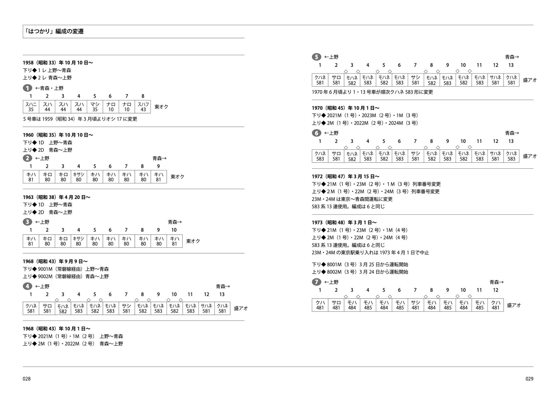 「はつかり」の登場/キハ80系への置き換え/東北本線全線複線電化と583系/クハネ583形の登場/増発が続く東北特急/485系「はつかり」の登場/列車号数の変更と1往復の増発/東北新幹線開業で「はつかり」は上野から姿を消す/東北新幹線上野開業/485系にグリーン車復活と函館乗り入れ対策/青函トンネル開業/583系の撤退/485系3000番台登場/「スーパーはつかり」の登場