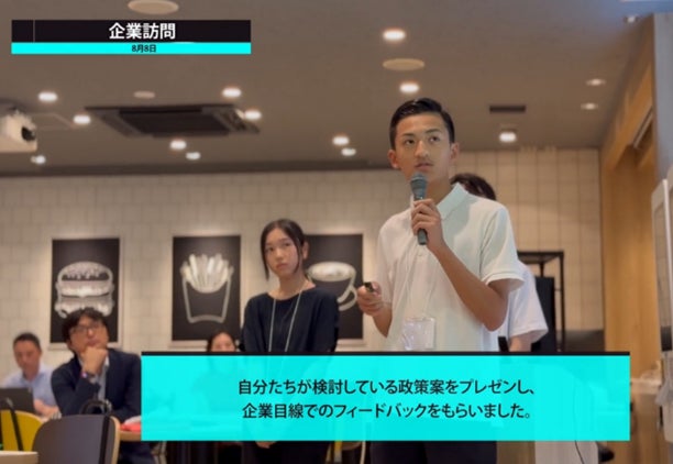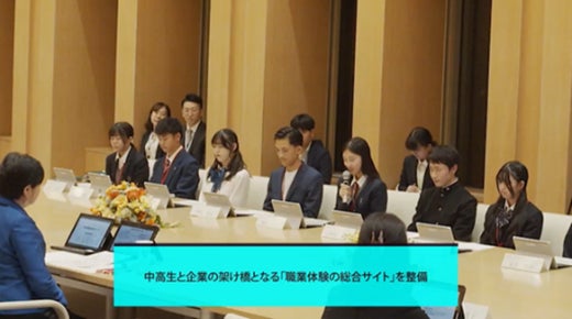 ドキュメンタリー映像では、オリエンテーション、企業訪問、中間報告会を経て、知事へ政策提案を行うまでの活動をまとめており、議論の過程や熱心に取り組む参加メンバーの様子を見ることができます。最初は慣れない様子のメンバーが、様々な経験を経て、小池知事にこれまでの成果を余すところなく伝えるまでの、中高生の成長を感じることができる内容になっています。