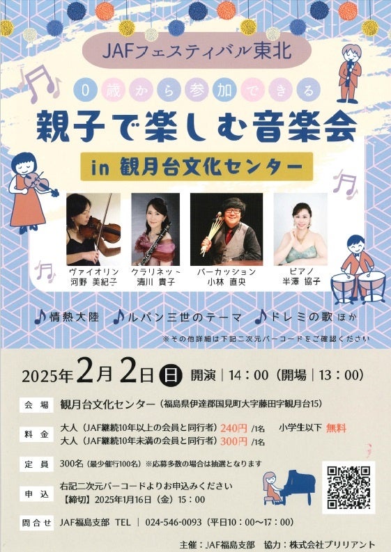 JAF(一般社団法人日本自動車連盟)東北本部(本部長 渡辺 広章)は、2025年2月2日(日)に観月台文化センター(福島県伊達郡国見町)で『JAFフェスティバル東北「0歳から参加できる 親子で楽しむ音楽会」in 観月台文化センター』を開催します。
