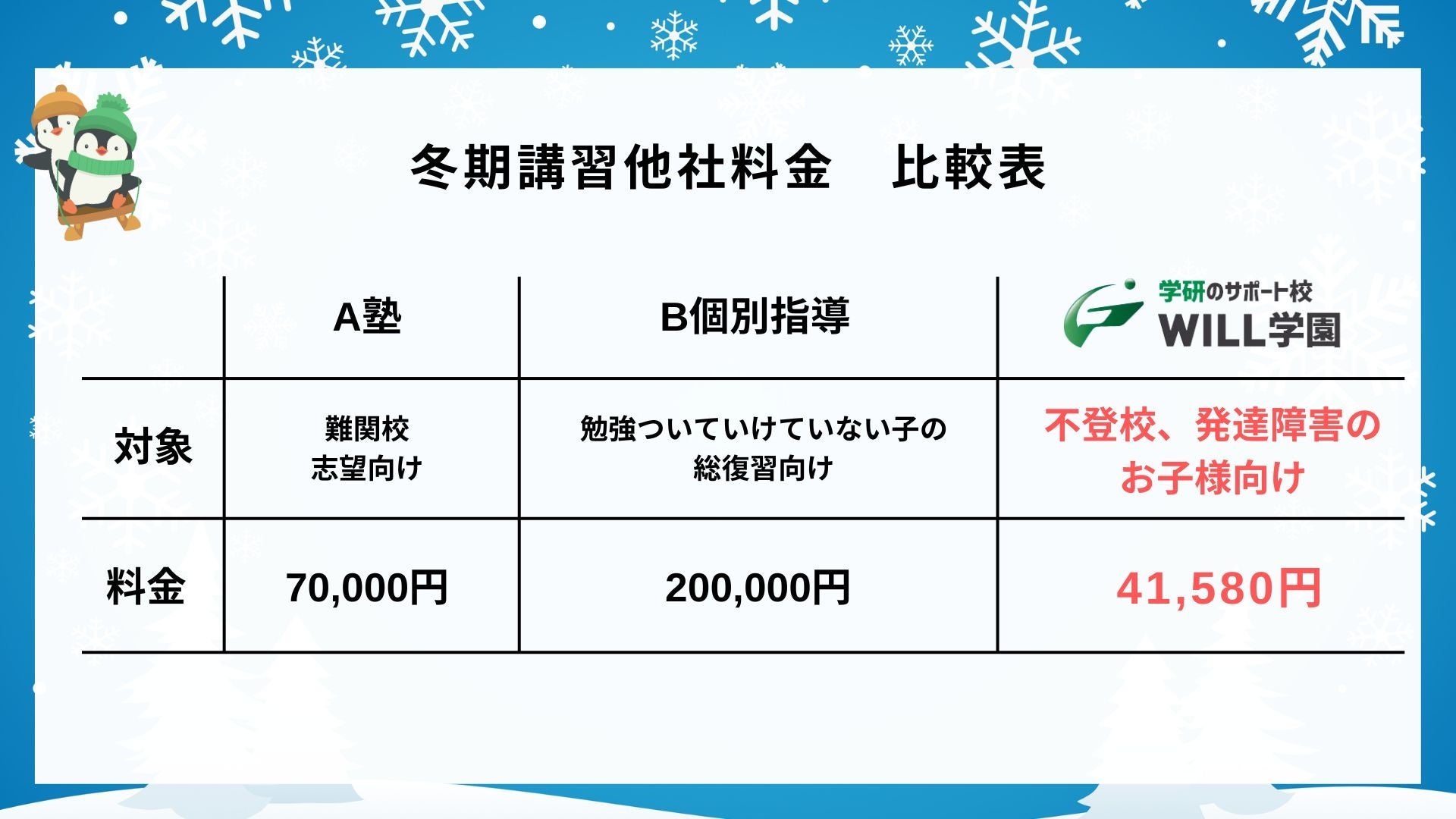 ①不登校、発達障害の生徒のみなさんに特化した冬期講習が、他社よりも安価に受けられる!