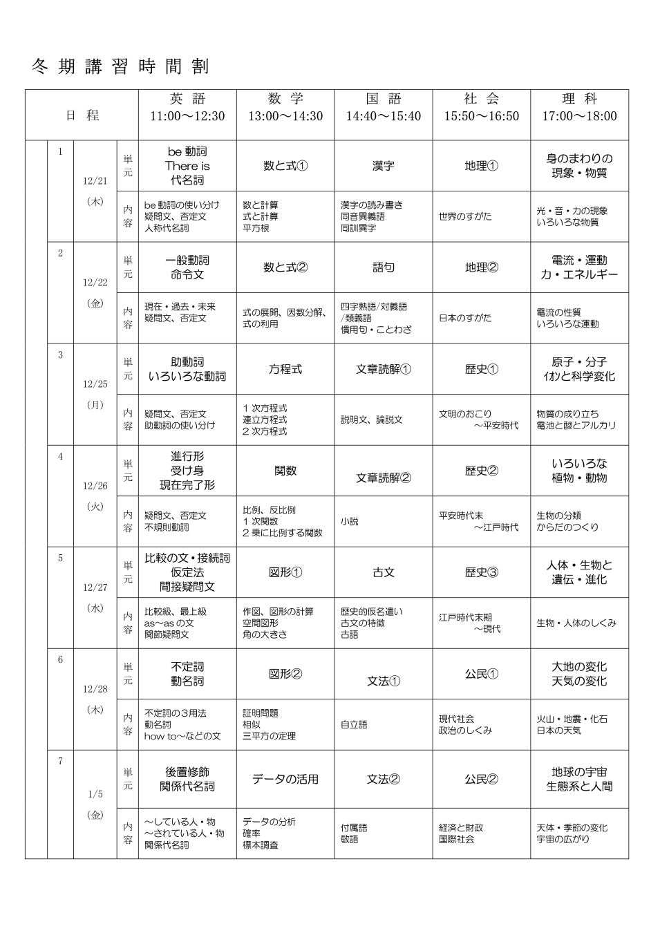 冬期講習講座内容