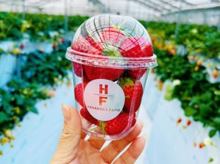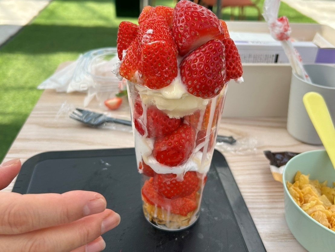 自分で収穫した15粒のいちごを使ってオリジナルパフェ作りと、1カップのいちごのおみやげ付き