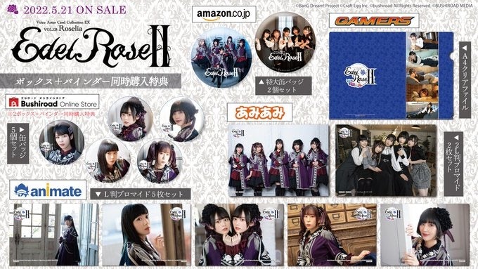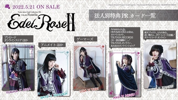 株式会社ブシロード(本社:東京都中野区、代表取締役社⻑:橋本義賢、以下ブシロード)のグループ会社にあたる株式会社ブシロードメディア(本社:東京都中野区、代表取締役社長:成田耕祐)は、Voice Actor Card Collection(以下:ボイコレ) EX VOL.03 Roselia『Edel RoseⅡ(エーデルローゼツー)』が明日2022年5月21日(土)に発売することをご案内いたします。