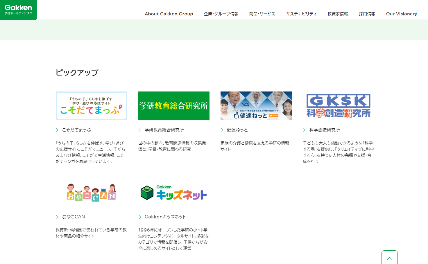簡潔に学研グループの今と未来の姿を説明したページです。初めてのユーザーの方にも短時間で学研グループのことを知っていただける内容になっています。