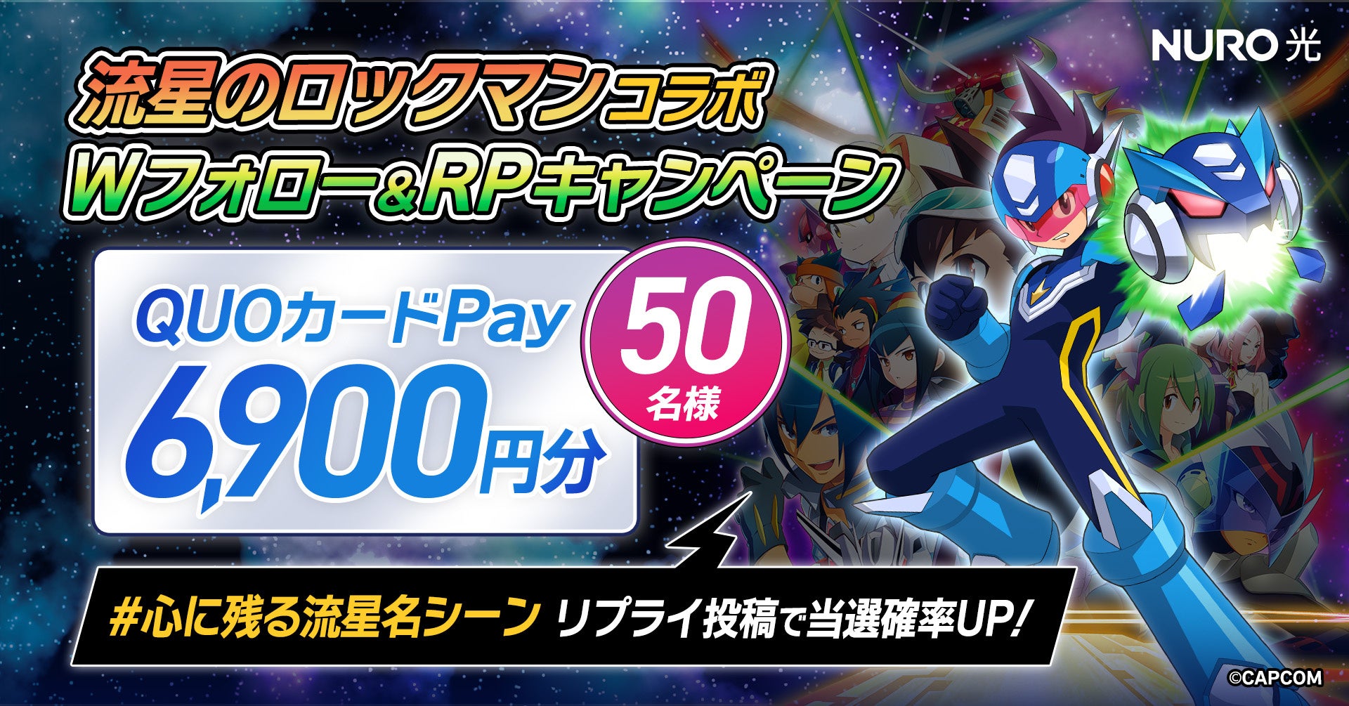 内容:期間中、「NURO 光」公式Xアカウント(@NUROhikari_Sony)およびロックマンシリーズ公式Xアカウント(@ROCKMAN_UNITY)をフォローし、キャンペーン対象ポストをリポストすると、抽選で50名に「流星のロックマン」オリジナルデザインのQUOカードPayを “6,900” 円分プレゼント。さらに、ハッシュタグ「#心に残る流星名シーン」をつけて対象ポストにリプライすると、当選確率がアップ。