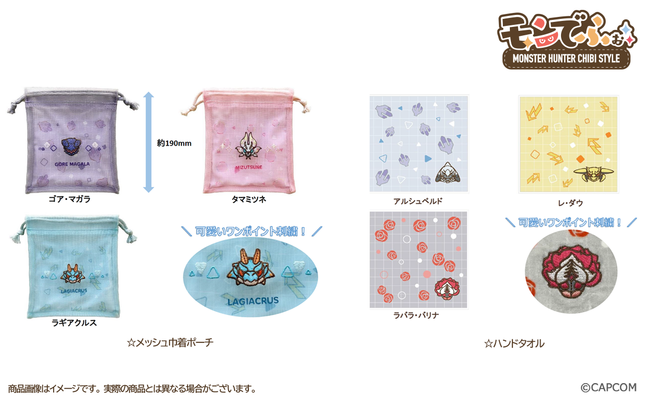 「モンスターハンター」シリーズに登場するモンスターを「ぬいぐるみ」タッチで描いた、かわいいデフォルメシリーズの新作の予約開始! メッシュ素材の巾着ポーチ、ワンポイント刺繍入りのハンドタオルがラインナップ! メッシュ素材の巾着ポーチ、ワンポイント刺繍入りのハンドタオルがラインナップ!