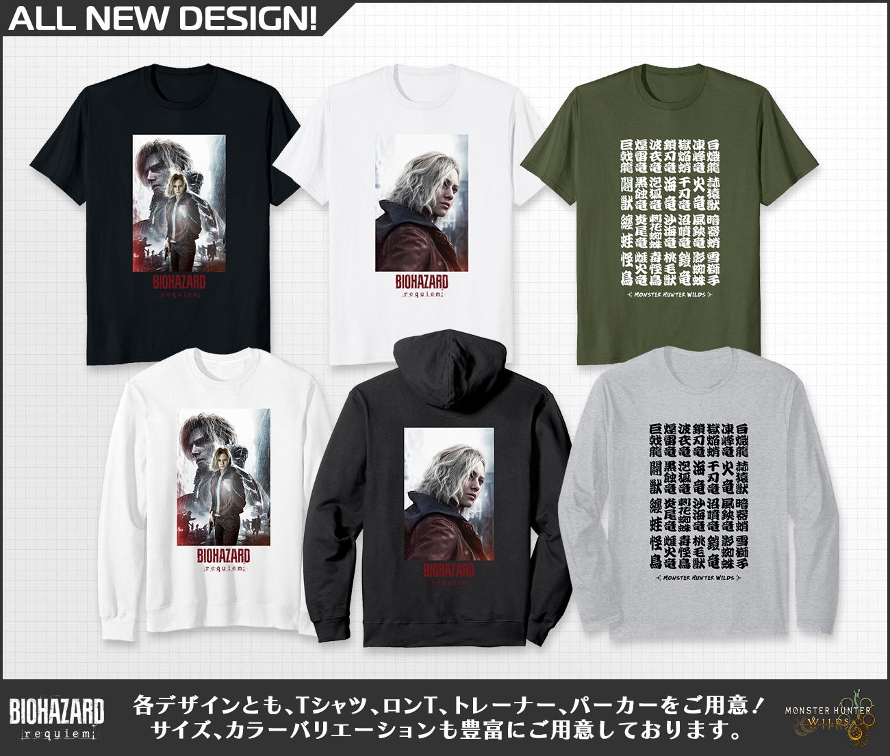 ついに発売となったシリーズ最新作『バイオハザード レクイエム』から2種類のアートを使用した新デザインと、発売から1年を迎える『モンスターハンターワイルズ』からモンスターの漢字名称がデザインされた新デザインが登場! 半袖Tシャツはもちろん、ロンT、トレーナー、パーカーのお好きなタイプからお選びいただける他、前面プリントと背面プリントをお選びいただけます。今すぐチェック!