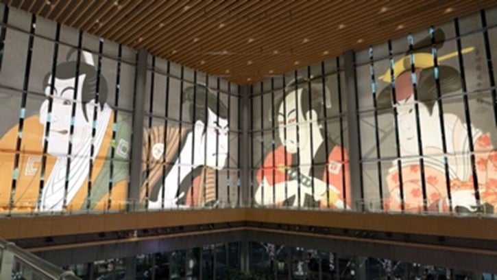 ・丸の内ビルディング内壁面では浮世絵を描いた「人」にフォーカス。「六大絵師の共演」をテーマに展開します。