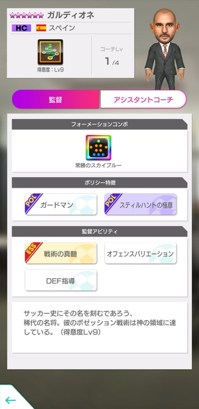 該当の選手を編成すると強くなるフォーメーションコンボ「常勝のスカイブルー」と戦術得意度Lv9を持つ新★6監督「ガルディオネ」が登場!「ガルディオネ」のポジションエディットは自由度が高く、ポジションを調整することが可能です。