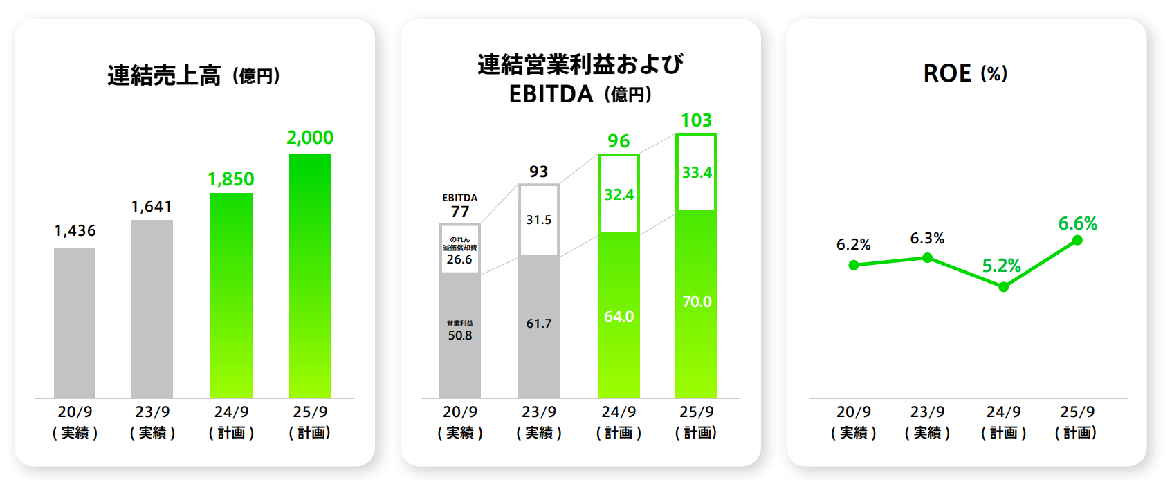 2025年9月期には売上高2,000億円(2023年9月期からのCAGR 10.4%)、営業利益70億円(同 CAGR 6.5%)を目指します。資本効率についてはROEで6.6%を目指します。