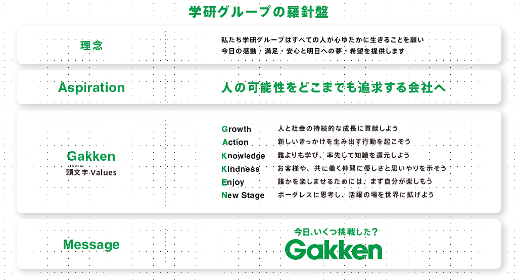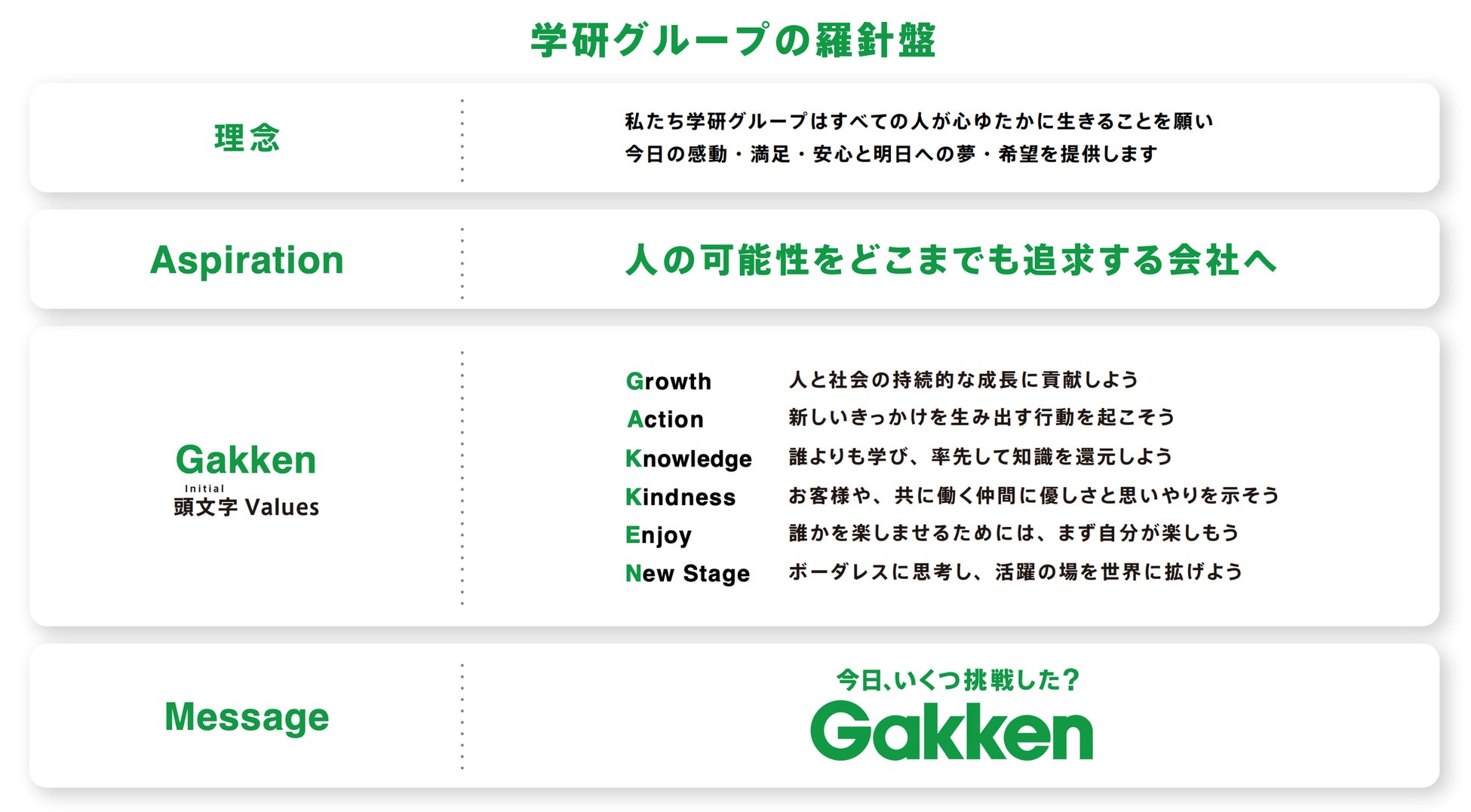 新たに目指す世界の実現に向けて、私たちがこれまで大事にしてきた学研グループならではの価値をさらに磨き、課題を抱える地域、企業、個人のお客様、そして世界の国々に今まで以上に必要とされるサービスを社員一丸となって提供してまいります。