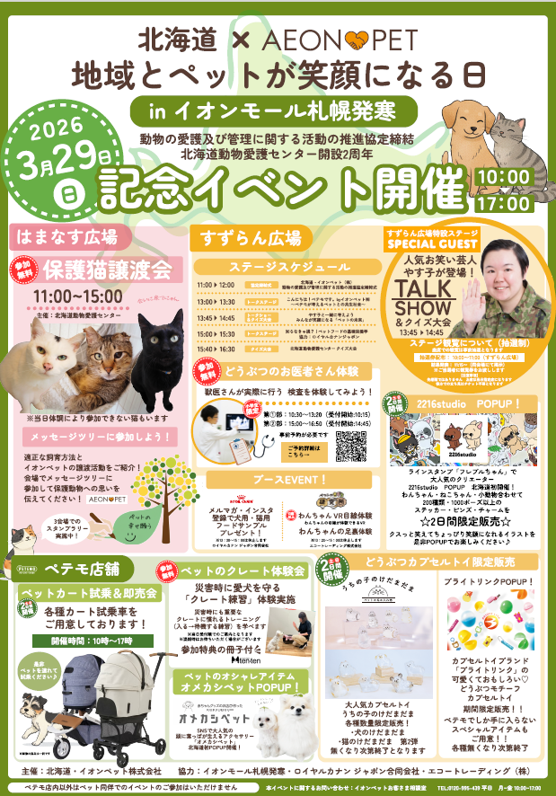 本イベントは、イオンペットと北海道が協定締結に基づき初めて開催する「動物の愛護及び管理に関する活動の推進」に向けた官民一体の取り組みです。北海道動物愛護センター(あいにきた)による保護犬猫の譲渡会や、イオンペットの獣医師によるこども獣医師体験コーナーのほか、協力企業の企画として、保護猫を家族として迎えている人気お笑いタレント・やす子さんをゲストに迎えたトークショーなど、多彩なプログラムを実施予定です。ペットを飼っている方はもちろん、ペットを飼っていない道民の皆さまも、楽しみながら動物愛護や適正飼養について学んでいただける内容となっています。