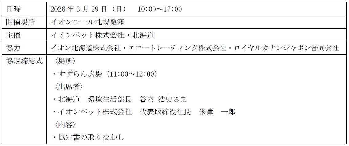 協定締結当日には、イオンモール札幌発寒にて、協定締結式とともに、道民の皆さまに動物愛護への理解を深めていただくことを目的とした記念イベントを実施いたします。