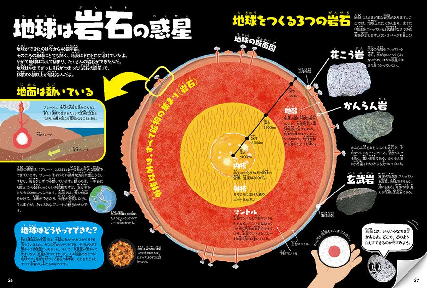 本誌では、体験キットにつく鉱物の図鑑ページや実験の紹介はもちろん、鉱物ができるまでの地球の歴史を追った記事、うっとりするような美しい宝石の写真など、地球と宇宙の歴史がつまった鉱物の魅力をたっぷり伝えます。