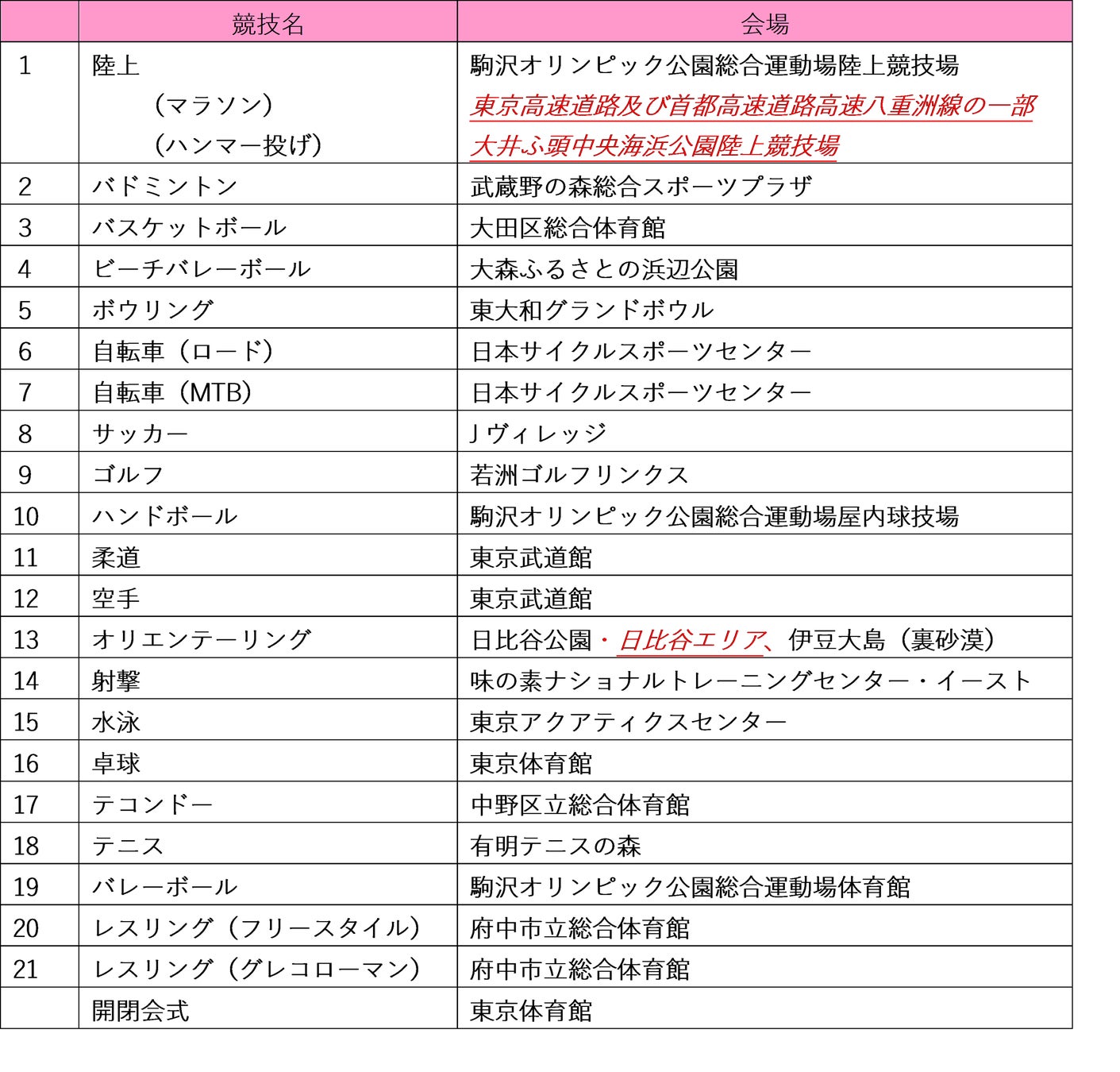 その他の競技会場及び練習会場については以下のとおりです。赤字(下線・斜体)部分が