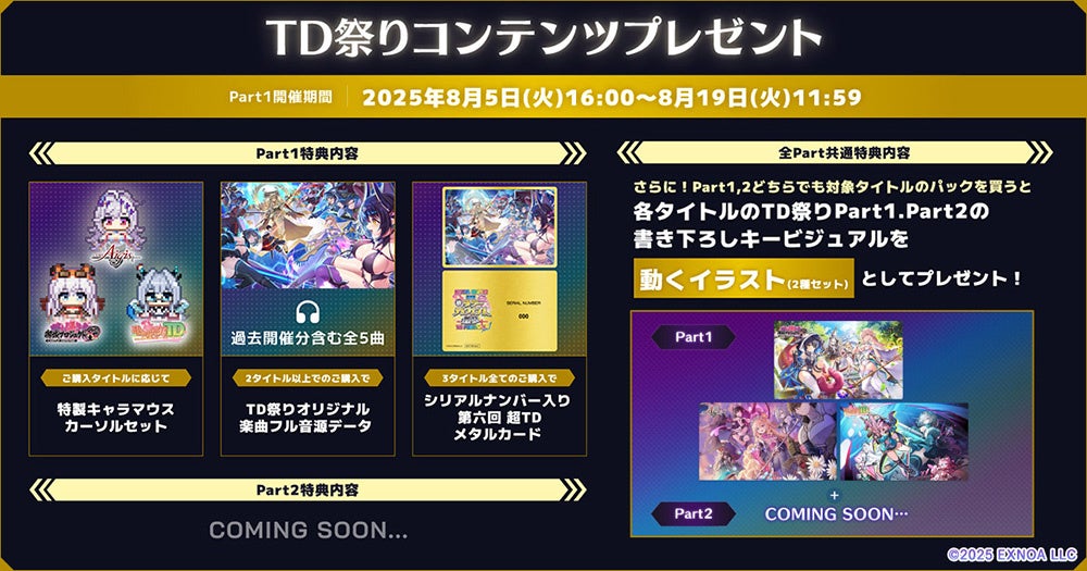 「第六回超TD祭りpart1パック」を期間中に購入すると、カーソルが可愛いドットのキャラクターに変わる「特製キャラマウスカーソル」や過去開催分を含む全5曲の「TD祭りオリジナル楽曲フル音源データ」や「シリアルナンバー入り第六回 超TDメタルカード」など豪華オリジナルコンテンツが購入したタイトル数に応じて、おまけとしてもれなく受け取れます!