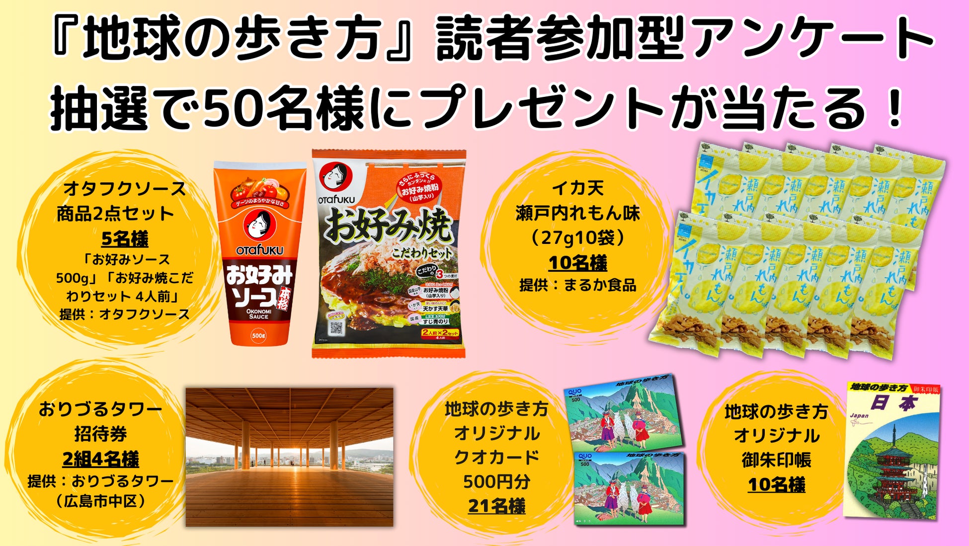 広島県民はもちろんのこと、出身者・在住経験者・訪問経験者など広島に縁のある方々にアンケートを実施。表紙の絵柄募集、よく使う方言、広島県民あるある、お気に入りの広島関連スポットをお尋ねします。アンケートに答えてくださった方のなかから抽選で、広島人溺愛のおたふくソース関連商品、イカ天 瀬戸内れもん味、おりづるタワー招待券、地球の歩き方オリジナルクオカードなど、すてきなプレゼントをお贈りします。