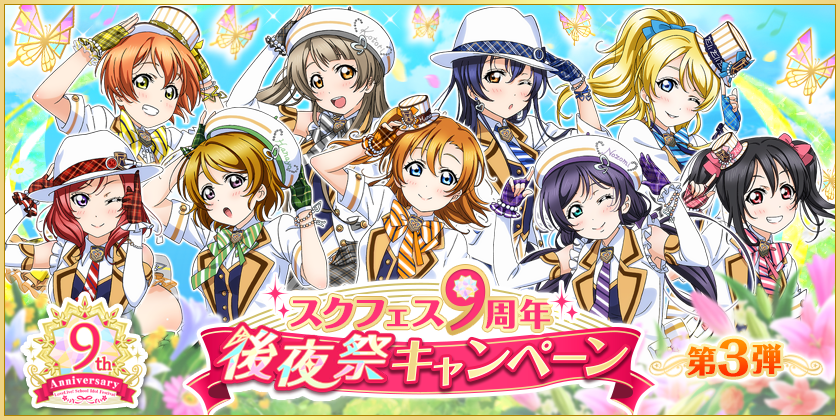 株式会社ブシロード(本社:東京都中野区、代表取締役社長:橋本義賢)は、KLab株式会社(本社:東京都港区、代表取締役社長:森田英克)と共同開発いたしましたスマートフォン向けアプリ『ラブライブ!スクールアイドルフェスティバル』(以下、スクフェス) においてスクフェス9周年後夜祭キャンペーン 第3弾の開催をお知らせいたします。是非貴社の媒体にてお取り扱い頂きますようお願い申し上げます。