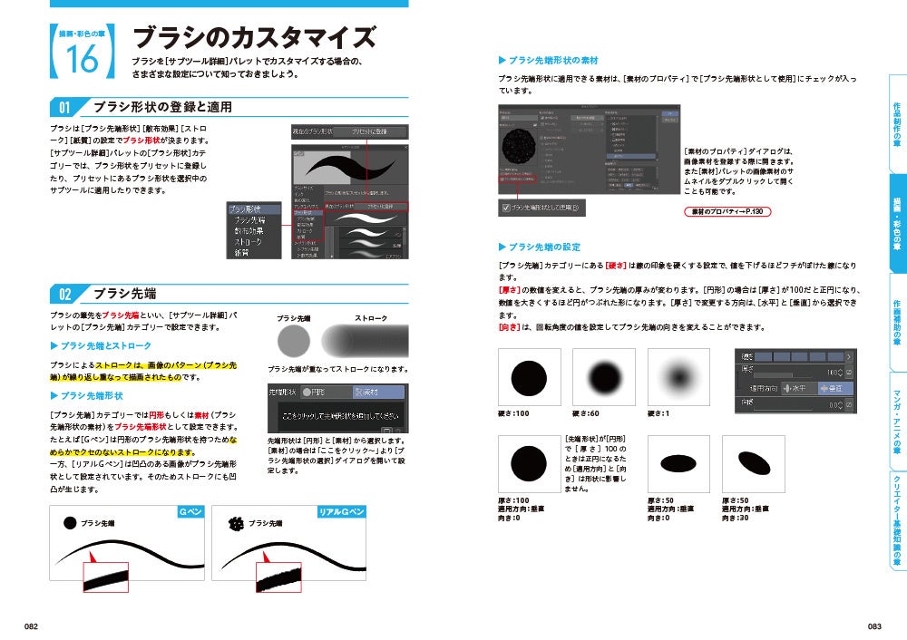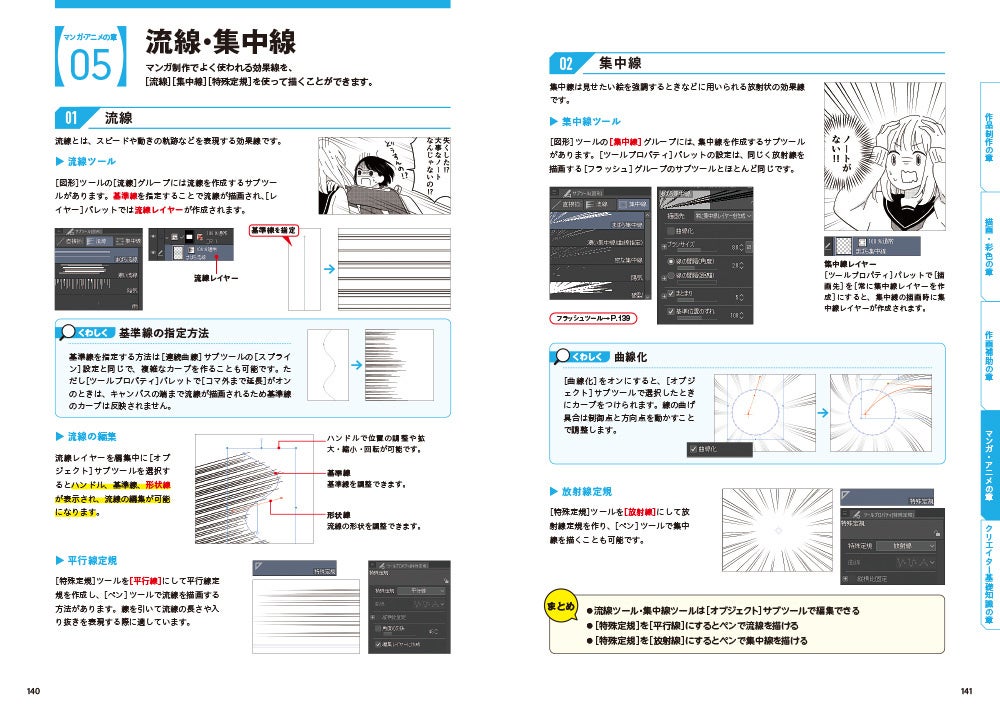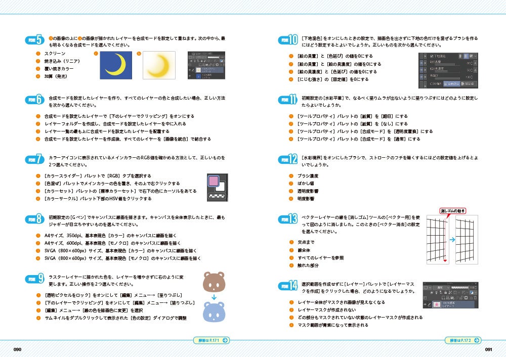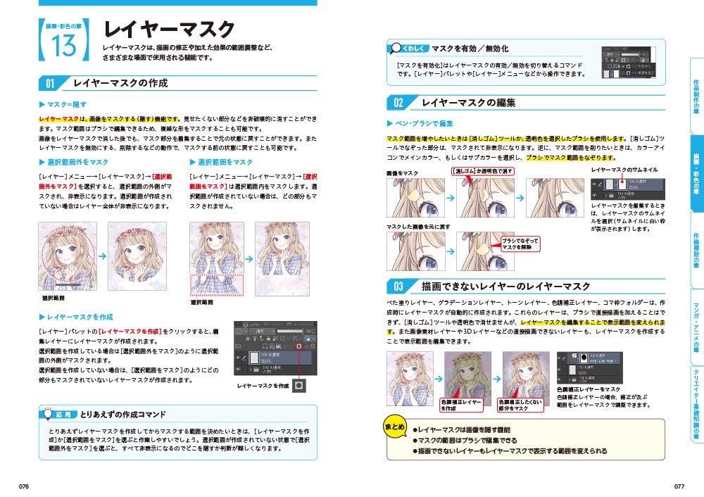 レイヤーの種類/レイヤーの整理/レイヤープロパティの効果/レイヤーの合成モード/描画色の設定/ジャギーとアンチエイリアス/塗りつぶしツール/ツール以外の塗りつぶし/はみ出し防止と色の変換/混色しながら塗る機能/水彩ブラシの使い方/ベクターレイヤーの編集/レイヤーマスク/グラデーションの作成と編集/補正と入り抜き/ブラシのカスタマイズ