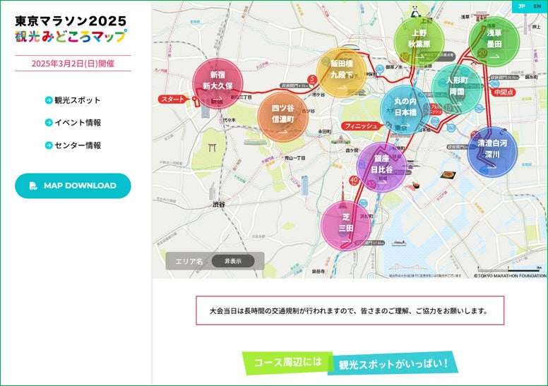 2025年3月2日(日)に開催される「東京マラソン2025」に向けて、ランナーや観戦者の皆様が東京をより満喫できる特設観光マップ「東京マラソン2025 観光みどころマップ」(https://tm-map.com/)を2025年2月5日(水)に公開いたしました。