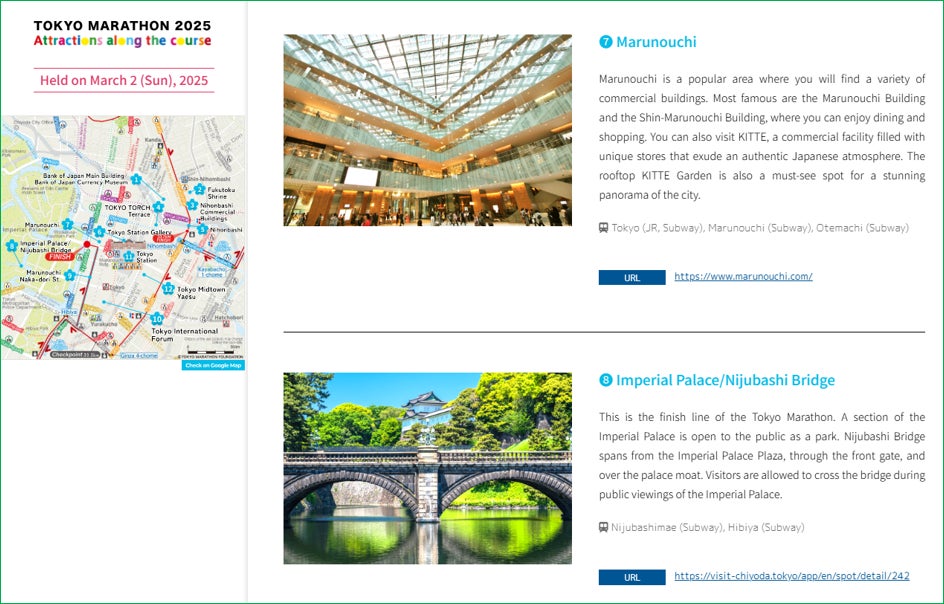 本マップでは、東京マラソンのコース周辺の観光スポット等を100か所以上紹介しており、マラソンを走る方だけでなく、沿道で応援する方々、そして国内外から訪れる観光客の皆様にも東京の魅力を存分に楽しんでいただける内容となっています。