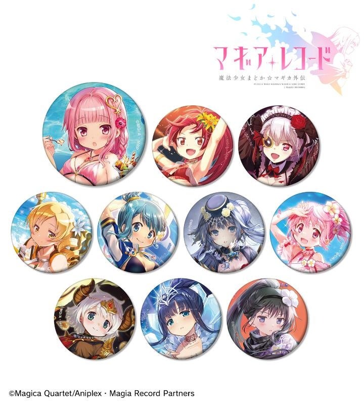 環いろは、佐倉杏子、和泉十七夜、巴マミ、美樹さやか、八雲みたま、鹿目まどか、梓みふゆ、七海やちよ、暁美ほむらのイラストをマットな手触りの缶バッジに仕上げました。