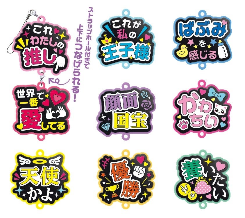 上下にストラップホールがついているので、好きなワード同士を組み合わせたり、大好きな推しのストラップなどとつなげて使うことができます♡