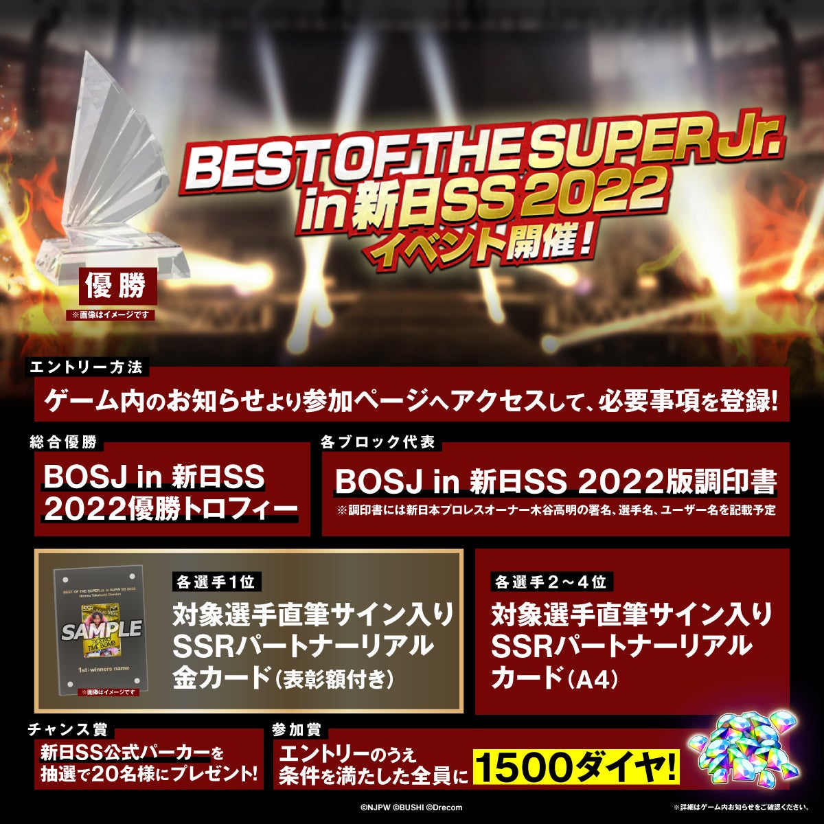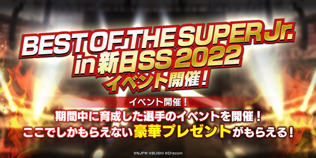 株式会社ブシロード(本社:東京都中野区、代表取締役社長:橋本義賢)は、株式会社ドリコム(本社:東京都品川区、代表取締役社長:内藤 裕紀)と共同開発しているスマートフォンゲームアプリ『新日本プロレスSTRONG SPIRITS』(以下、新日SS)にて、リアル報酬などが狙えるイベント『BEST OF THE SUPER Jr. in 新日SS2022』を開催した事をお知らせいたします。ぜひ貴社媒体にてお取り扱い頂きますよう何卒よろしくお願い申し上げます。