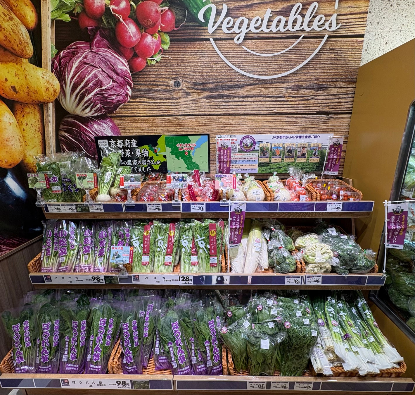 野菜売場では、JA京都市版GAP基準※で品質・安全性が認証された、近郊の生産者さまが育てた旬の野菜を地場野菜コーナーにて展開します。また、京都中央卸売市場より仕入れた「九条ねぎ」や「京みず菜」、「花菜」などの京野菜や鮮度を保ったままお届けする京都府産の「シャキ直野菜」を取り揃えます。