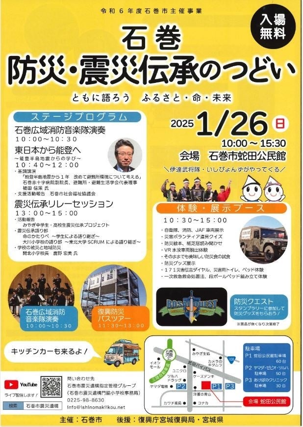 「石巻防災・震災伝承のつどい)とは“ともに語ろう ふるさと・命・未来”をテーマに、展示・体験を通して防災・震災の知識を次の世代へ伝えるとともに、防災・伝承団体の存在と活動を広く周知することを目的に、東日本大震災の集団移転地がある石巻市主催でおこなわれます。