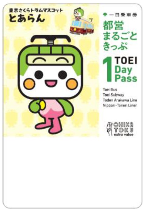 都営まるごときっぷ(都営交通一日乗車券)は、都営地下鉄、都営バス(江東01系統を除く。)、東京さくらトラム(都電荒川線)、日暮里・舎人ライナーを1日に限り何回でもご乗車できるお得な乗車券です。