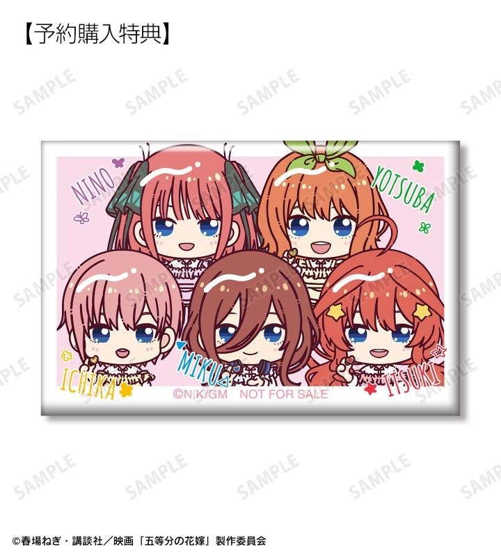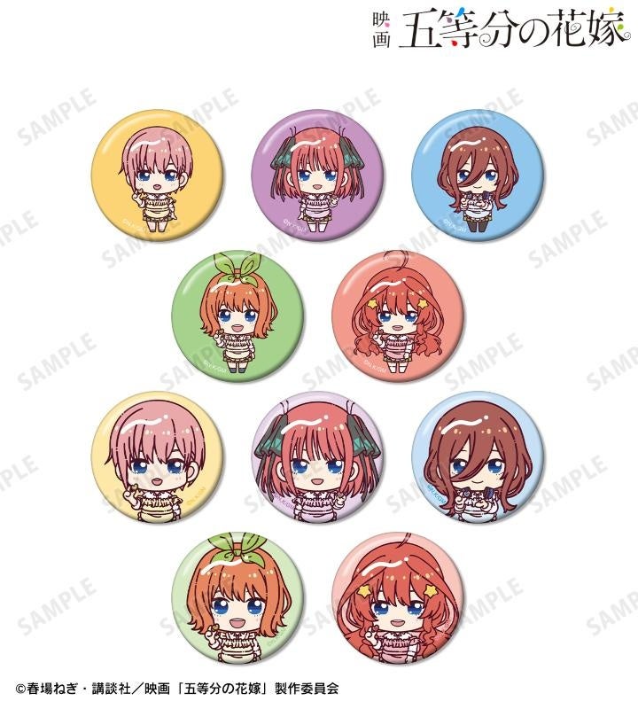 中野一花、中野二乃、中野三玖、中野四葉、中野五月がちょこんと立っているちびキャラを新たに描き起こし、缶バッジに仕上げました。