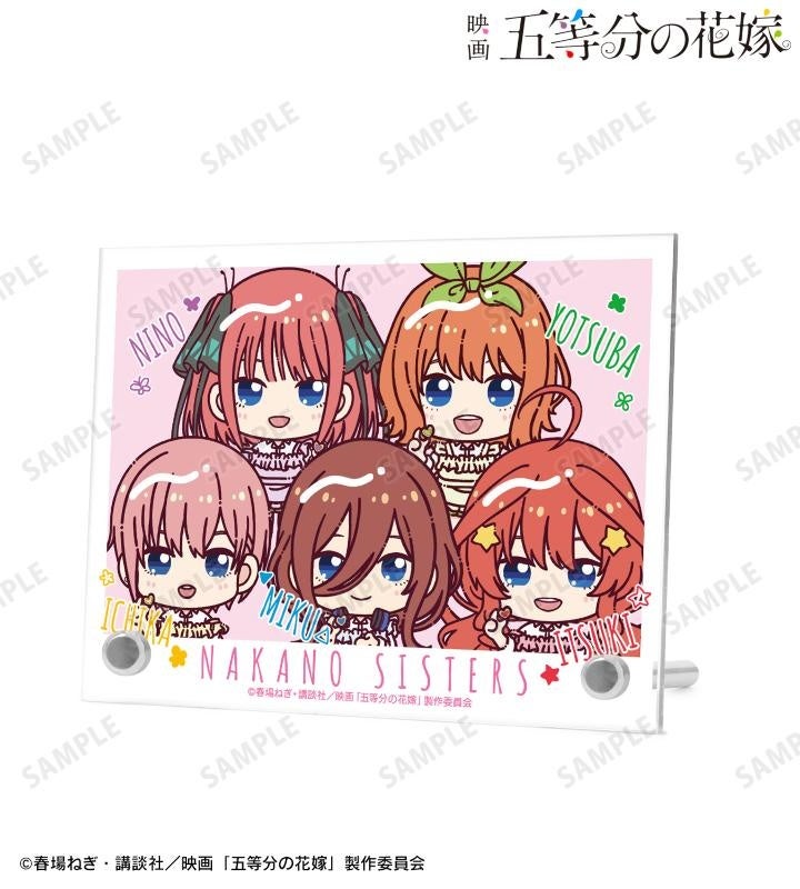 中野一花、中野二乃、中野三玖、中野四葉、中野五月がちょこんと立っているちびキャラを新たに描き起こし、A6サイズのアクリルパネルに仕上げました。