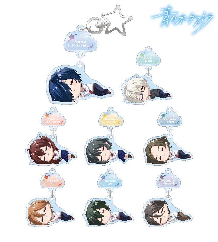 青野 一、佐伯 直、秋音 律子、小桜 ハル、山田 一郎、羽鳥 葉、原田 蒼、鮎川 広明のイラストをゆらゆら動くアクリルキーホルダーに仕上げました。
